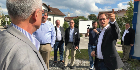 Above, Thomas Eberl (eGRID) explains how batteries connect to the Wildpoldsreid residential microgrid, while Mos Kaveh (Dean, UMN College of Science and Engineering), Senator John Jasinski (MN District 24), Rolf Weberg (UMN Natural Resources Research Institute), and Greg Ridderbusch (CEO Connexus Energy) look on.